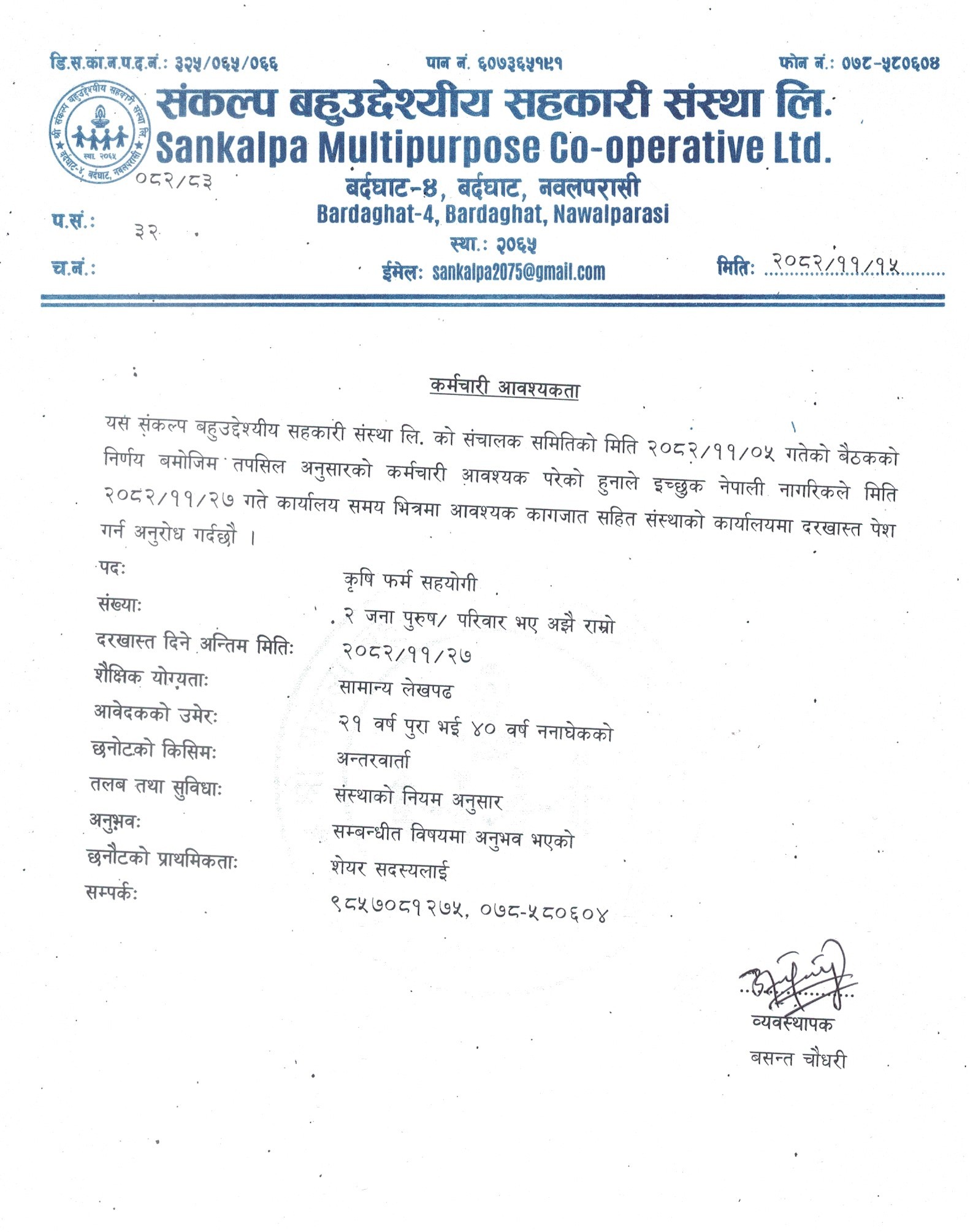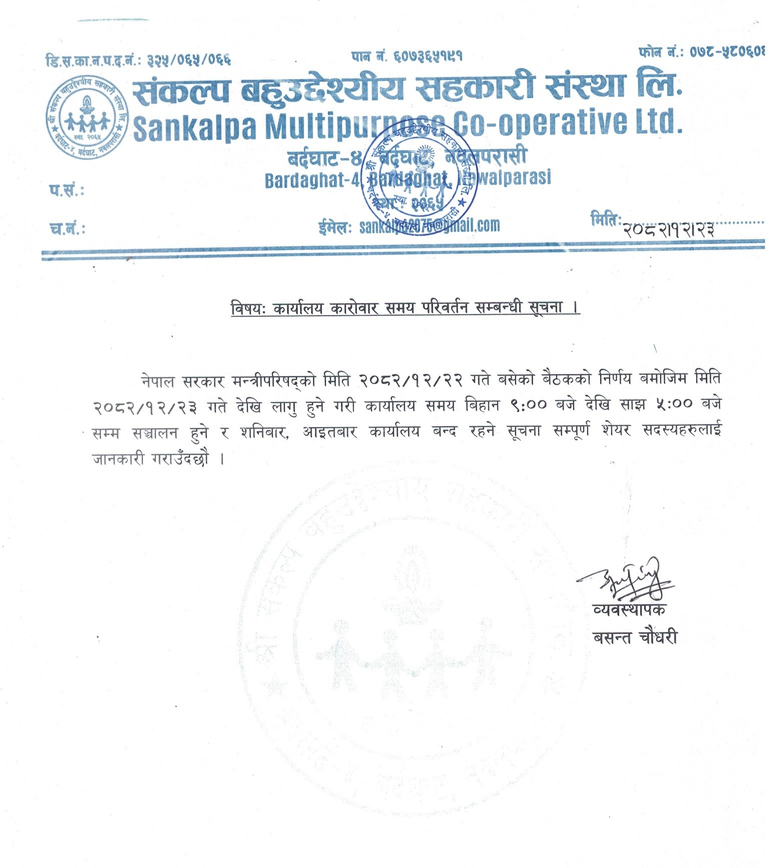 उपरोक्त सम्बन्धमा यस श्री संकल्प बहुउद्देश्यीय सहकारी संस्था लि.को मिति २०८१ भदौ ५...